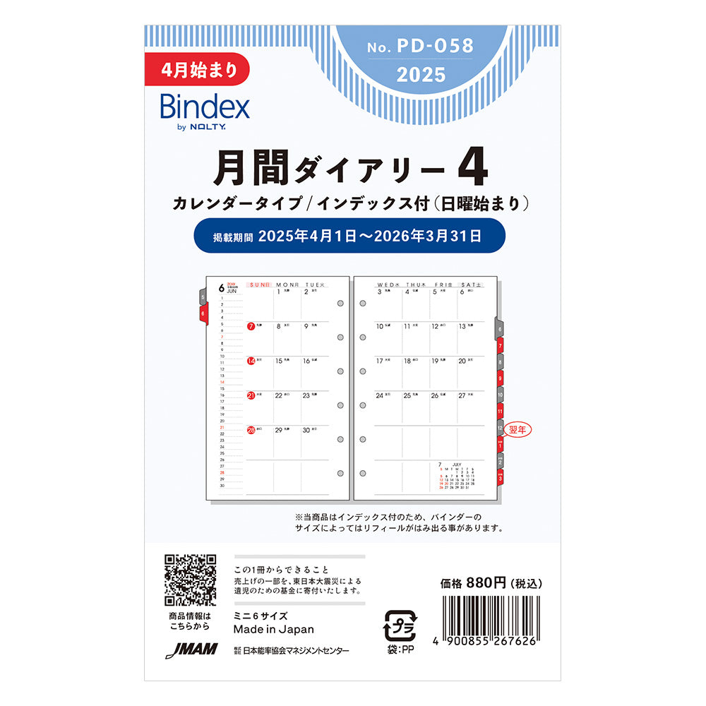 2025年 4月始まり 月間ダイアリーカレンダータイプインデックス付(日曜始まり)PD058 能率 手帳 リフィル