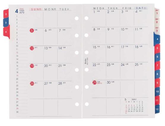 丈夫で汚れにくいインデックス付き日曜始まりシステム手帳用リフィル